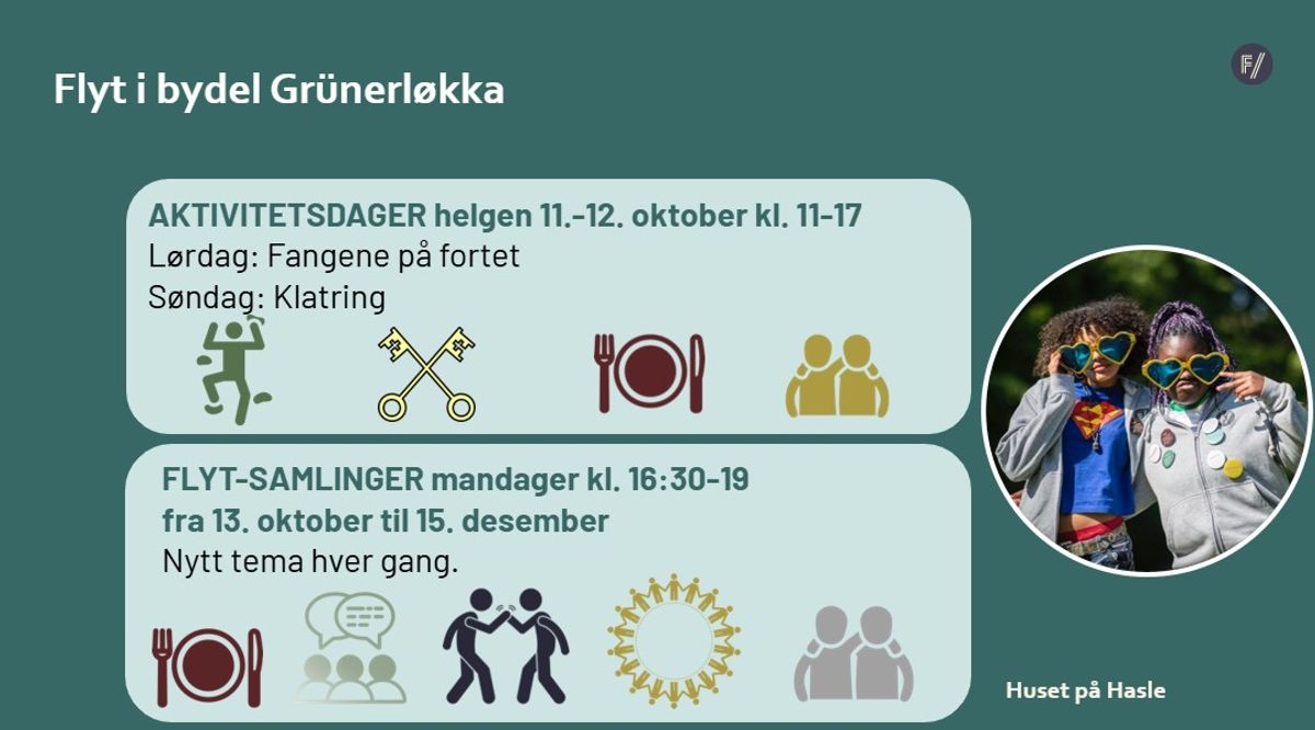Det blir samtidig et foreldremøte lørdag 11. oktober fra 14:00-15:00. Vi håper alle foreldre kan stille på dette, så får dere god informasjon om Flyt og hva ungdommene deres får oppleve framover. Foreldre møter også i Huset på Hasle.